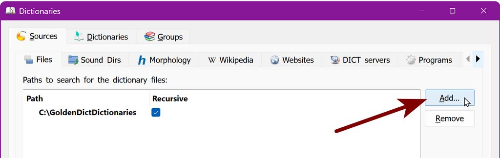 3. Open GoldenDict-NG and go to Edit > Dictionaries > Sources. Then select Add…